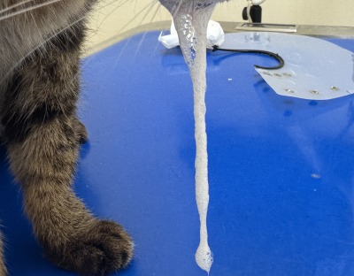 ↑エルーラを飲ませた後の流涎。けっこうな量でることがあります。これを見ると「この薬続けても大丈夫かな?」とオーナー様が思っても不思議ではないと思います。この流涎は時間が経つとおさまります。