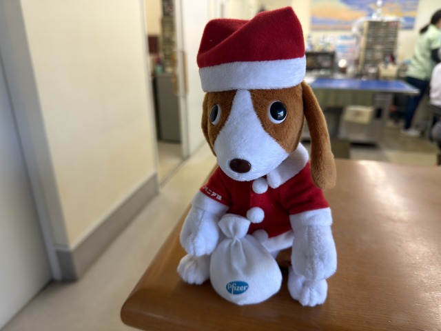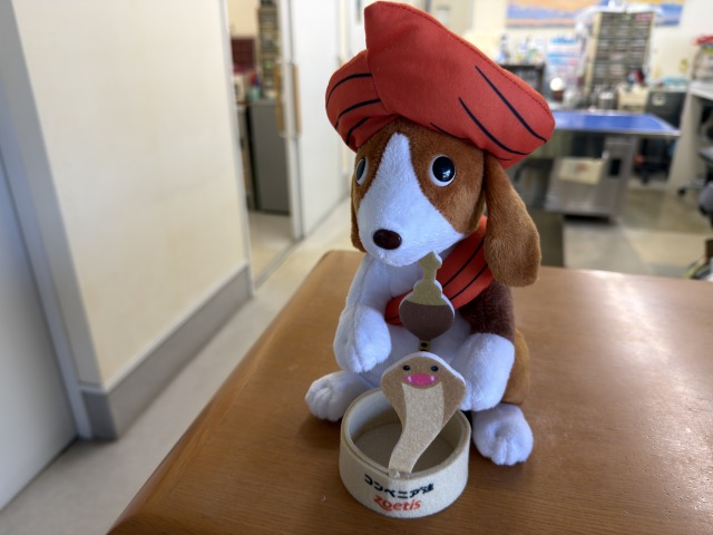 当院受付のチャームポイントであるゾエティス様からいただいている犬のぬいぐるみ。